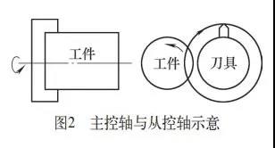首先兩個(gè)主軸要分為主動(dòng)軸和從動(dòng)軸,成為同步標(biāo)準(zhǔn)的軸稱作主動(dòng)軸,與主動(dòng)軸同步移動(dòng)的軸稱為從動(dòng)軸。在多邊形加工中,刀具軸作為主動(dòng)軸,工件軸作為從動(dòng)軸(見(jiàn)圖2)。